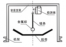●KJT-LLI型料流檢測裝置采用下垂鏈球與物料接觸� 檢測方式。當膠帶� 送物料時,物料推動球并帶擺臂向一�(cè)偏移,若偏移角度大于20°時,�(nèi)部開�(guān)動作,輸出一組開�(guān)信號�